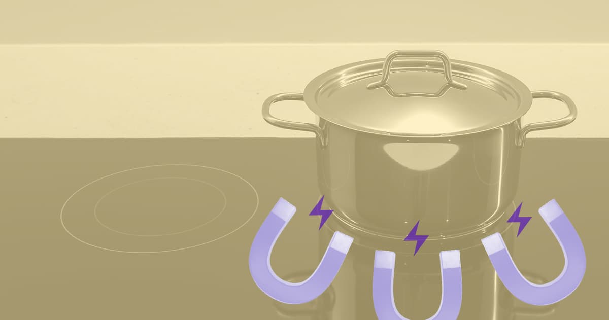 An induction stove powers an electromagnet, powered by electricity, to create a magnetic field. That magnetic field generates a fast-moving current (called an eddy current) inside the metals in your cookware — like a skillet, frying pan, or cast iron pan. This fast-moving current runs into resistance in your pan and generates the heat that cooks your food or boils your water.